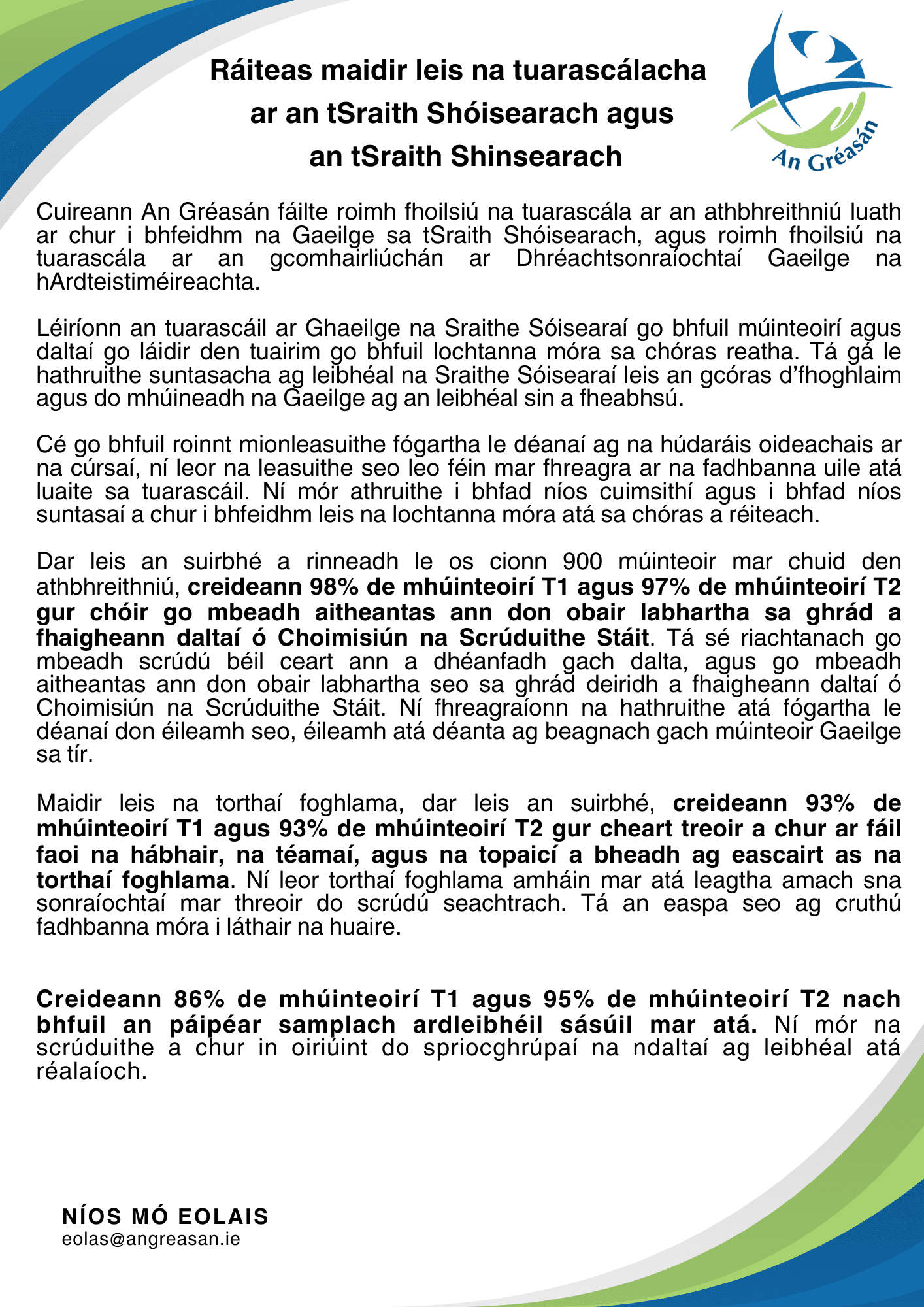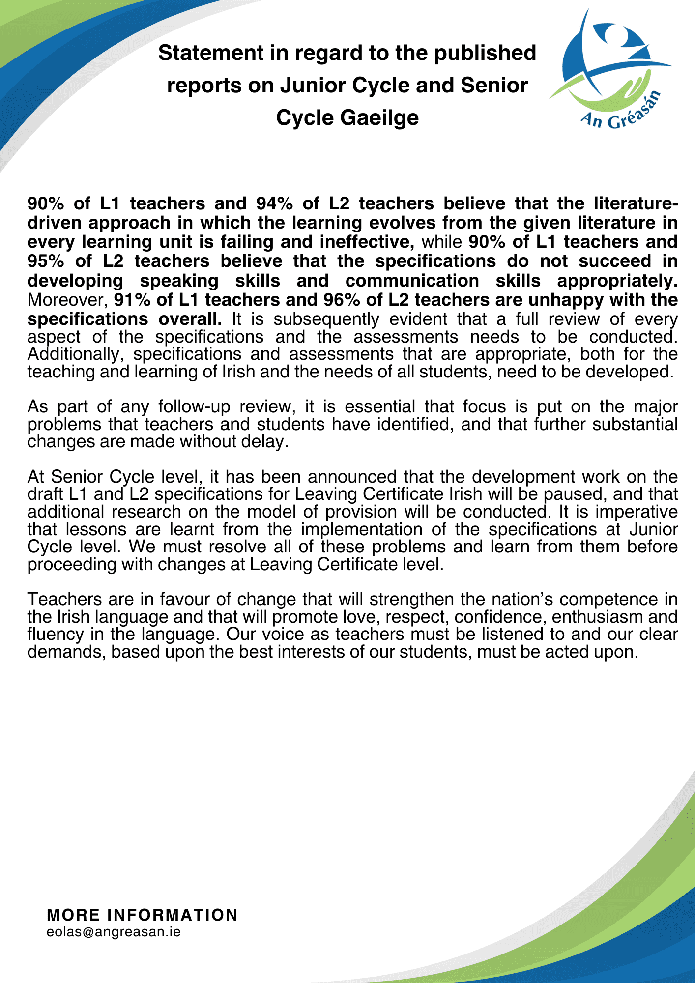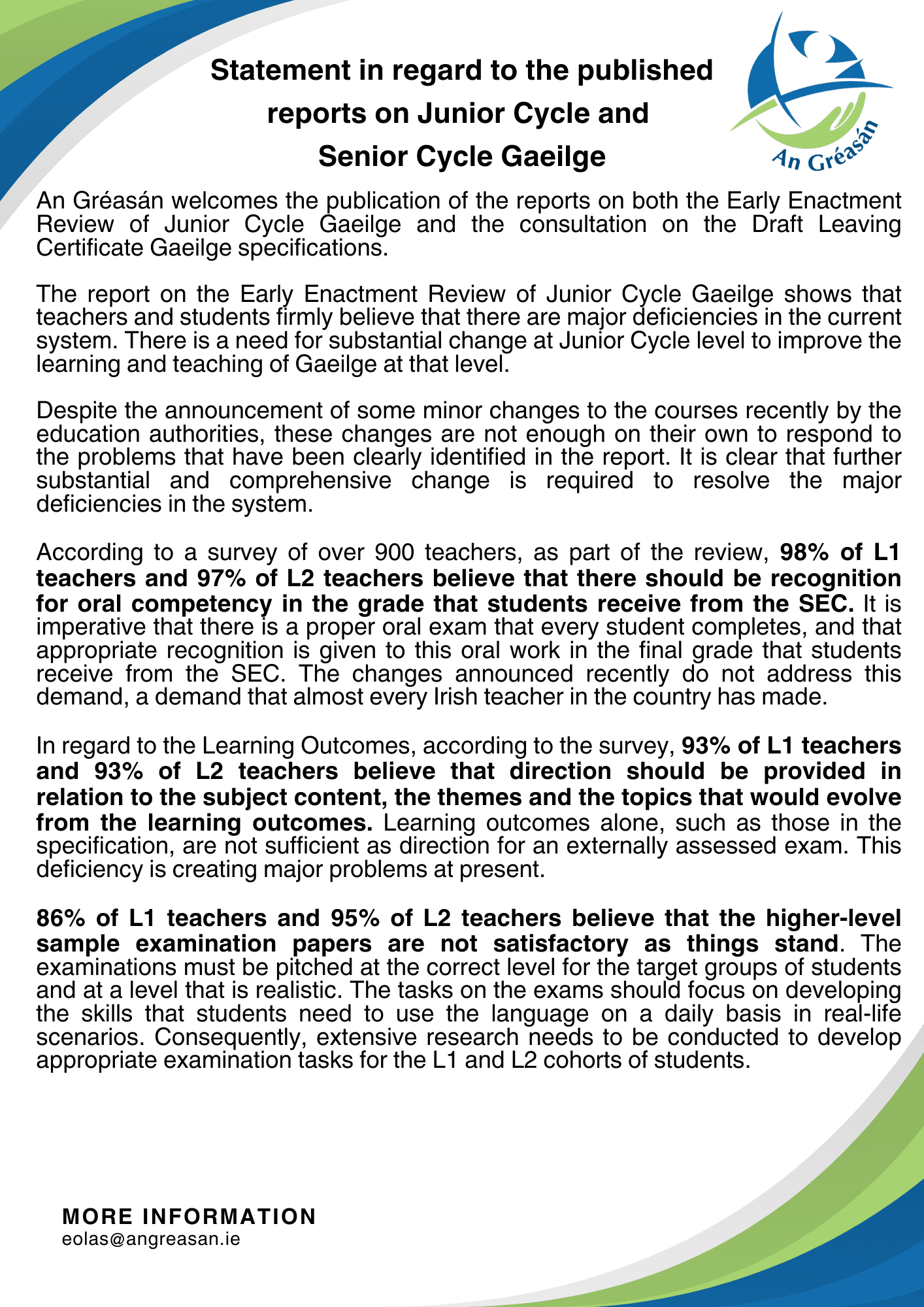 Ráiteas maidir leis na tuarascálacha ar an nGaeilge sa tSraith Shóisearach agus sa tSraith Shinsearach