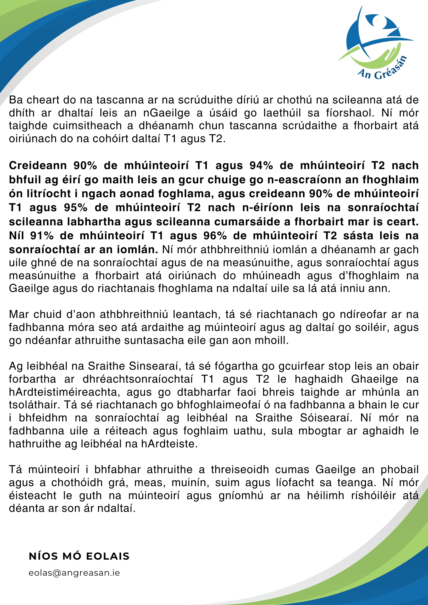 Next PostAighneacht 'An Gréasán' mar chuid den athbhreithniú ar chur i bhfeidhm luath na Gaeilge sa tSraith Shóisearach