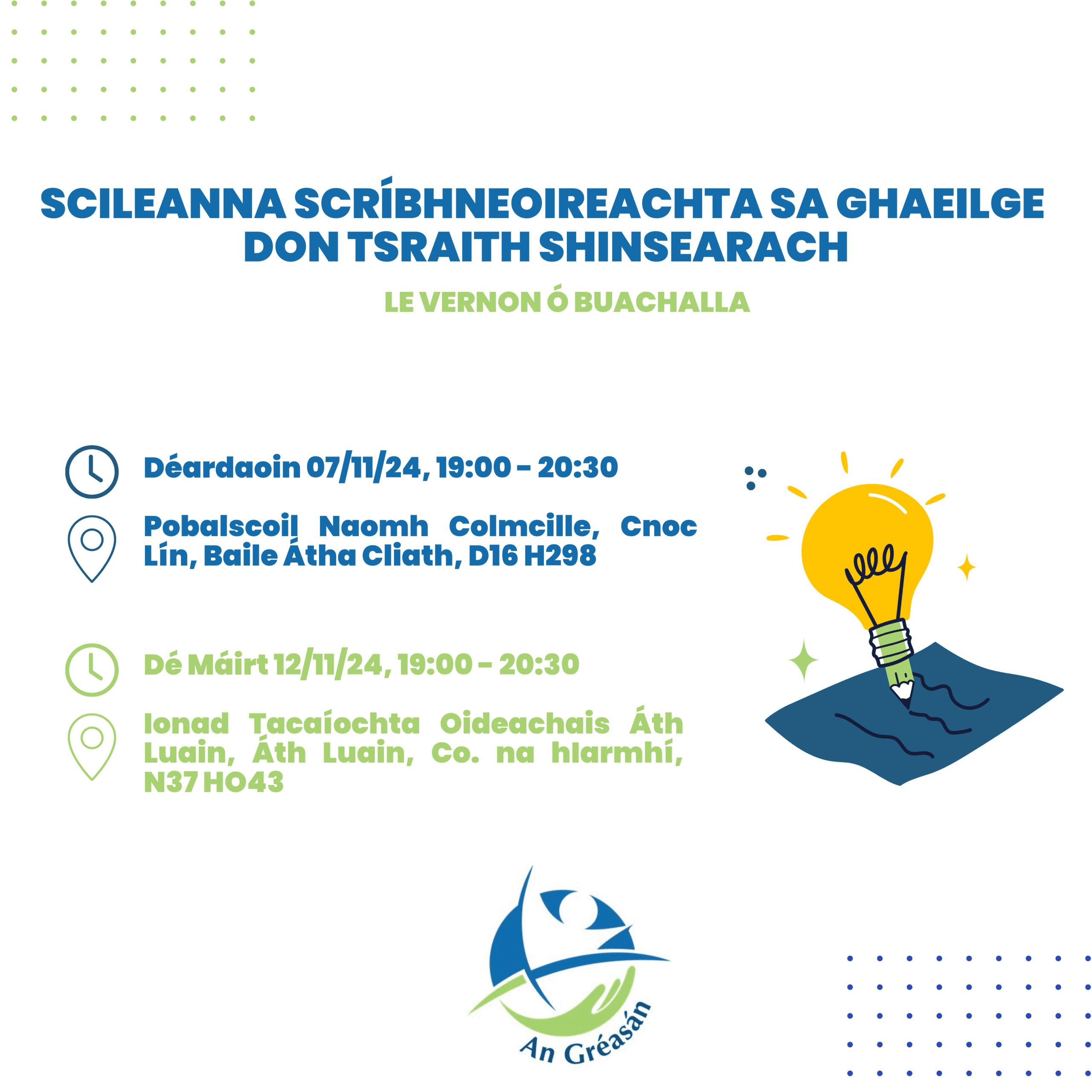 Áth Luain – 12/11/24: https://www.eventbrite.ie/e/ath-luain-scileanna-scribhneoireachta-sa-ghaeilge-don-tsraith-shinsearach-tickets-1049607984737/